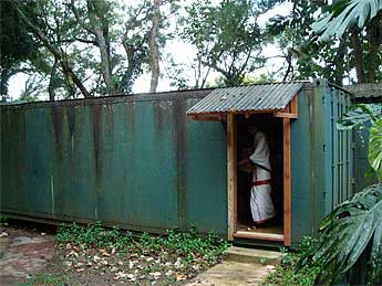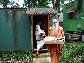 It happens that today was Archive Day, the one day each month that the entire publications team works together to sort through, log, protect and organize Gurudeva's lifetime legacy of audio recordings, videos and photos. This 40-foot container was installed a few years back just for the purpose of housing Gurudeva's gifts to the world as we go through the enormous task of digitizing everything for future generations to have access to. Here Nutanaya is leaving the container with a box of photos to be organized.
