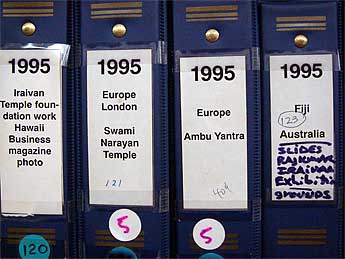 These blue and white binders, hundreds of them, contain the photos we took from the 1960s onward, up to the digital age, that is. After the late 1990s it was all digital. Each binder has several hundred photos, all sorted according to Gurudeva's travels and according to the year.