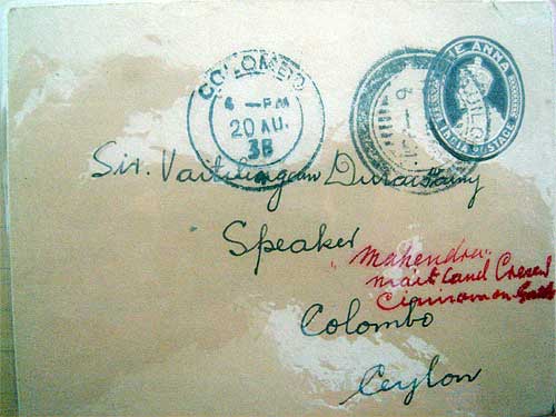 Another treasure from the past from Sri Lanka. While in Australia, a man came forward at Bodhinatha's seminar to hand us a letter and envelope written to his father by Yogaswami. Dated August 20, 1938. It may be the first time we are seeing his writing in English. Such a mature style. Palaniswami took out his small digital camera and captured this onsite in Melbourne. We thought you would all enjoy seeing Yogaswami's beautiful English script. The letter is in Tamil and we have captured that as well.