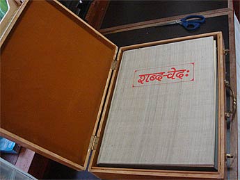 Coming in its own wooden case, this book helps fulfill Gurudeva's wish to have the Vedas and Agamas at the monastery. They have been quite elusive. This book is titled "Shabda Veda," published by Rajasthan Patrika, ISBN# 818632600121. The book is priced inside the cover at Rs5500 or US$300 and can be ordered through Moltilal Banarsidass, mlbd@vsnl.com. We should advise if you do order the book that the binding is not quite as well done as it might be, and may need to be rebound. It also weighs 30 pounds, so shipping is substantial.