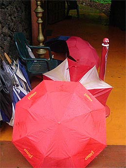 Umbrellas left open in front of Kadavul temple today, as pilgrims enjoy the 9am Siva Puja on a wet morning.
