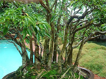 Outside, Tandu Sivanathan has brought us a new bonsai creation. It appears to be a forest of trees, but this entire forest in only two feet tall! Two bonsais are set by the temple pool to charm visitors.