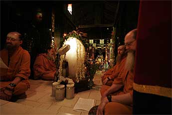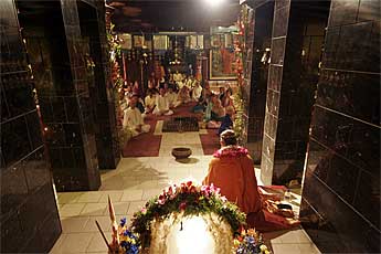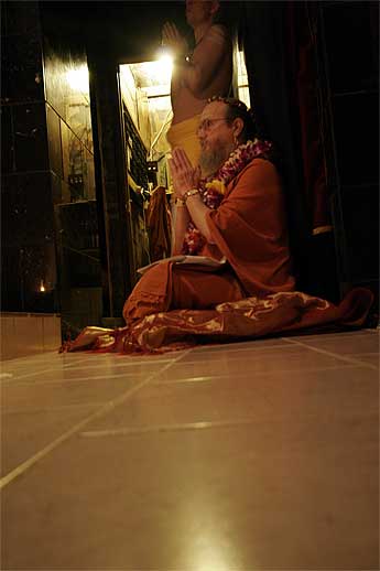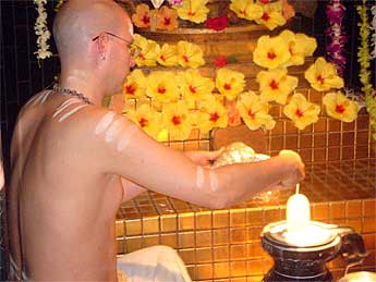 The following two videos are from the Abhishekam and then final ashtottara and arati. The first is 45 megabytes and may take some time. The second movie opens to a white screen. Click the controller to start. If you do not have quicktime, try right clicking on the movie to save to disk and play with Windows Media Player.