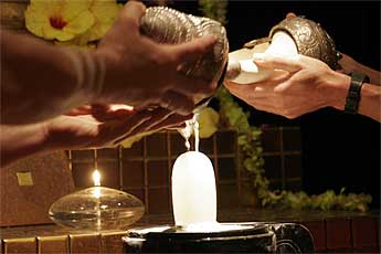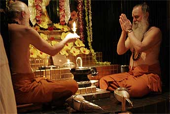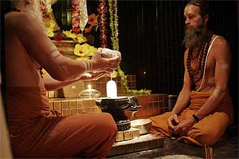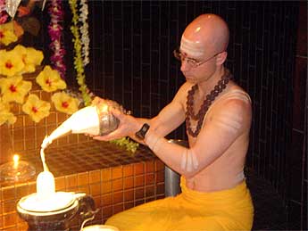 Paramacharya's Palaniswami and Ceyonswami begin the abhishekam...