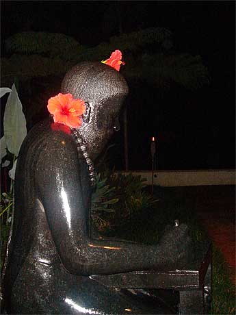 Seldom do we take photos outside at night, but on this Night of Siva we find ourselves in the dark during the short breaks. Here Saint Tiruvalluvar scribes his verses on ola leaves.