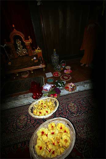 Offerings for the puja arrayed in the Guru Peedam awaiting their turn for decoration.