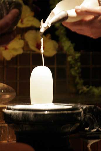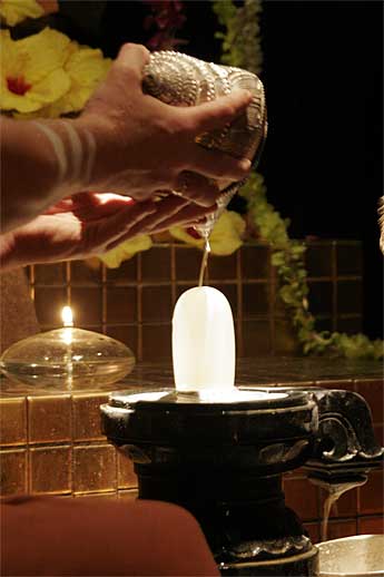 Special giant conches are used, and the crystal lingam is bathed continuously for about thirty minutes.