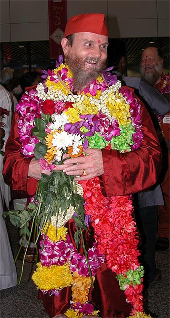 Here is Bodhinatha arriving at the airport in Malaysia, being showered with flower by the devotees..
