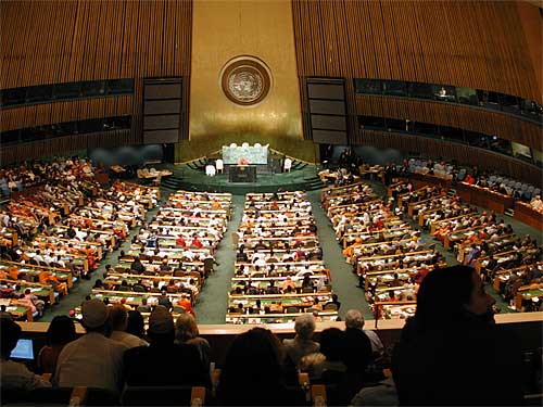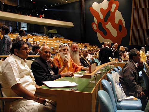 Gurudeva joined the unique event, called the United Nations Millennium Peace Summit, along with religious leaders from all the world's major faiths. For the first time in history religious leaders spoke in the Security Council chambers. This photo has dozens of swamis in orange robes in it. Gurudeva is on the right, toward the front.