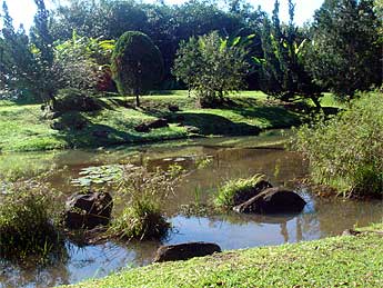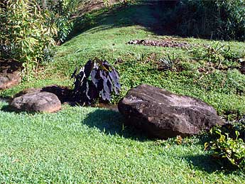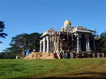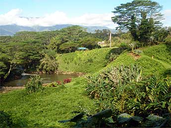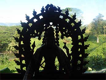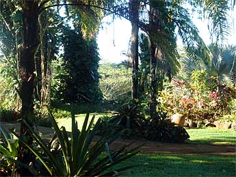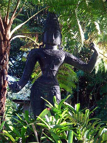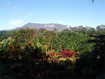 Weeks of tropical rain clouds and rains have vanished this morning, leaving the clearest sky imaginable. That's our Mount Waialeale above the temple gardens.