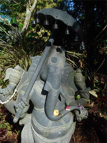 Ganesha is enjoying the morning sunshine, but He is being a bit circumspect about the rain, continuing to hold His umbrella aloft just in case.