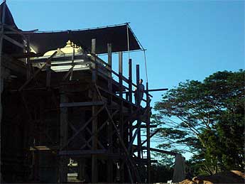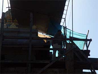 Deva is unpacking the gold leaf materials. He is working on the Chinna Gopuram today, leafing areas that were left undone during the assembly. Now he can add the finishing touches.