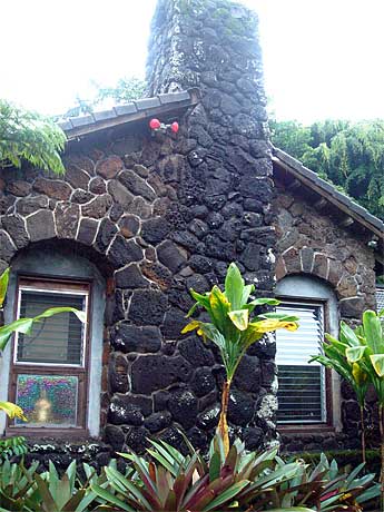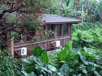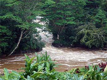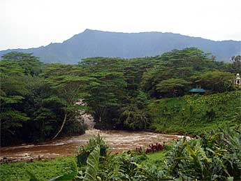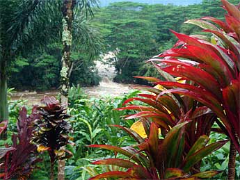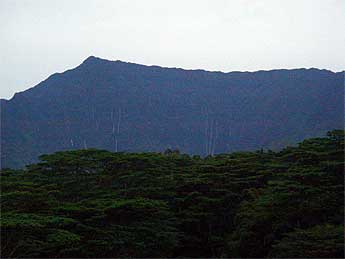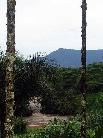 Rains of the tropical sort swept the island hard in the early hours before dawn, but before our meditation ended it had stopped and the clouds blew off the mountain, revealing 4-5 dozen waterfalls on the cliffs. Can you see them?