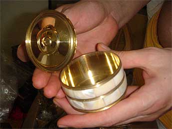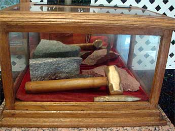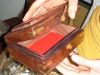Below is a case holding the chisel and mallot Gurudeva used to make the first chip on the first stone in Bangalore, India. We gold-leafed the mallot.