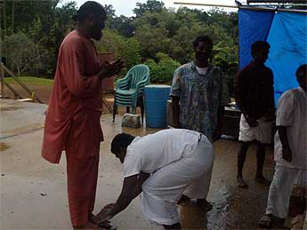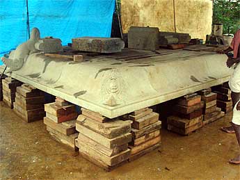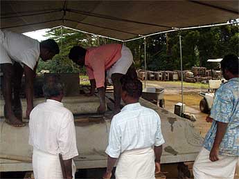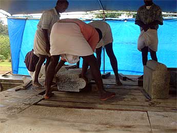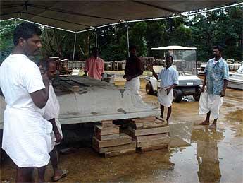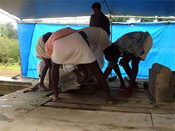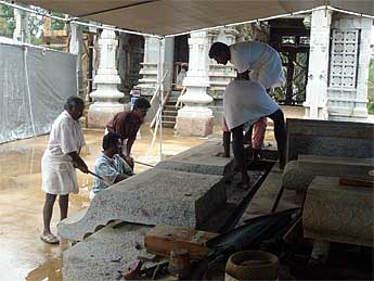 Palaniswami and Yoginathaswami visited the site to discuss issues and plans with the carvers, who greet Swami by touching his feet.