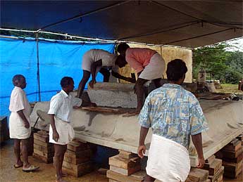 They are working today on the roofing stones, called sunshade. They fit it all on the ground, then lift it into place. The stones are ready, and this afternoon will be moved to the staging area where the crane can lift them next Sun 1. The silpis are so happy to have completed this challenging fitting task.