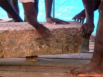 These larger sunshade stones require great care to move without leaving marks on the sculpted parts of the granite. We have a great team on Kauai!