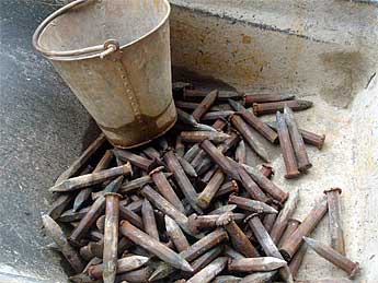 A pile of newly sharpened chisels wait their turn in a wheelbarrow.