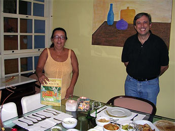 This is Andre's mother Alves, with a copy of "Monks Cookbook" in her hands and his father Clovis who just had a birthday two days ago but was away on business in another part of Brasil on duty for the National Brasilian Oil Company. He came home this evening, just in time for a this surprise dinner. Happy birthday Clovis!