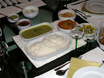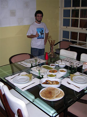 Many of you have downloaded the new Hinduism Today Digital Edition. Of course, the magazine content has been developed by our team here with the help of many around the world and the prototype for remote client architecture as well. But the "under the hood" programming that makes this modern-day remote internet "iTunes For Your Hinduism Today PDFs" application work was done by a brilliant young man in Niteroi Brasil who was have been working with for over a year... his name is Andre Alves Garzia. To thank him for all his excellent and hard work we did a remote catering job, by having gourmet vegetarian Indian dinner sent to his home from the Natraj Restaurant in Rio DeJaniero. Here is Andre at the dinner table.