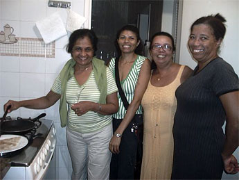 On the left if Guilda Antao, who is an Indian lady from Goa who went to Brasil years ago and started the Natraj restaurant. When she got a phone call all the way from Hawaii requesting a meal be send to the Garzia family she was amazed! She personally took responsibility to deliver the meal with one of her helpers, driving 1.5 hours from Rio to Niteroi, which is a small town across the bay. Here she is at the stove with her assistant Lucia in the stripped green shirt, Andre's mother in the orange dress and another Lucia on the right who helps the Garzia household.