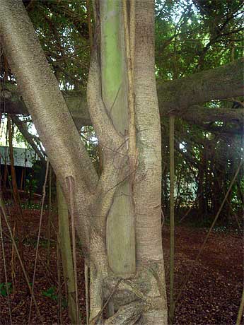 Our photographer discovers a 6" by 6" board once used to hold up a limb, now almost completely engulfed with the tree. One day it will disappear.