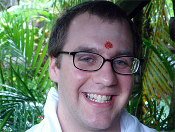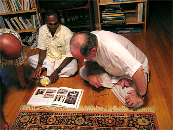 Today our young aspirant from Maryland, Paul Hardman, is working on the Ganapati Kulam publishing team, helping the swamis edit an article on Indian music. Paul is a musician so his knowledge proved immensely useful for this task. You can see how happy he is to put his skills to work for the monastery.