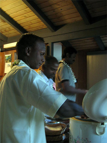 The silpis serving themselves from the buffet style meal.