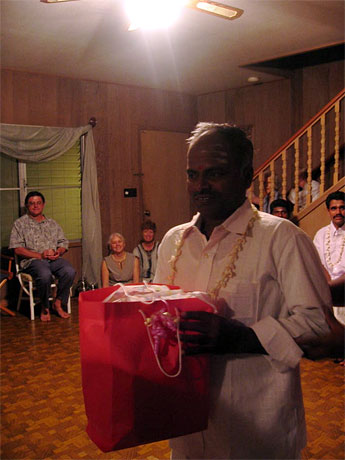 Receiving a small gift from the church members.