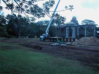 It's always exciting when our crane arrives at the temple site, seen there as a blue beam behind the flag of dharma.