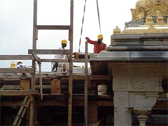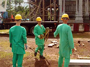 They are working on the West side of the temple, lifting stones that will for a parapet above the "naga" course, which represents the kundali.