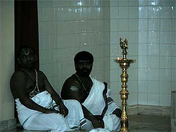 Bodhinatha is greeted by the two priests of the San Antonio temple. Krishna Bharattar on the right and Rama Linga Shastri on the left. One Vaishnava and one Saiva.