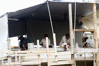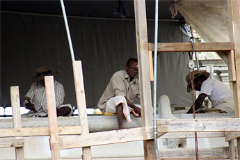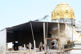 The roof is actually being covered with blue sloping tiles just like those on the roof of the Mandapam.