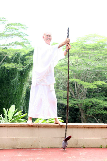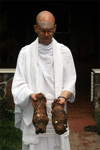 Today the Siddhidata Kulam shared news at lunch. Sadhaka Adinatha brought this banana flower stem for show and tell.
