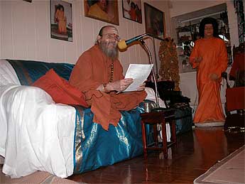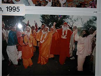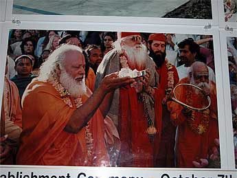 It is Gurudeva and to his left is the founder of Barsana Dham Swami Prakashananda Saraswati and to the left of him is Swami Bua Maharaj from New York.