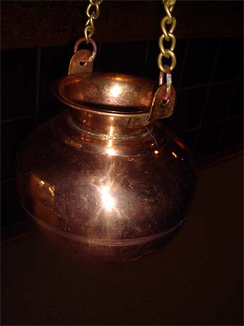 The parents brought a wonderful gift for the temple. It is a copper urn which is hung above a Sivalingam and filled with water. A tiny hole in the bottom drips water constantly, bathing the Lingam in an "eternal abhishekam."