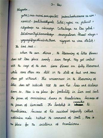 In part, it says, "When the Sun shines, the blossoming of lotus flowers does not take place evenly, even though they get contact with the rays of the Sun. Some flowers are fully blossomed while some others are still in the state of bud and some others get withered. This unevenness in the blossoming of lotus does not indicate that the Sun has likes and dislikes. Even so, there is no place for partiality in Siva and Sakti."