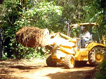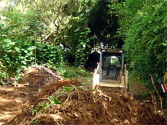Trees have been removed and the Bobcat is piling up dirt and branches.
