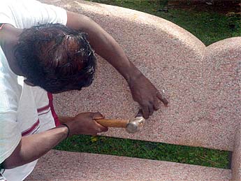 He noticed a small black stain, and is using his carver's "sandpaper" to remove the splotch. Softly hammering away the top few molecules of stone and along with it the blackened spot.