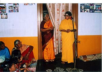 Sri Saimatha giving a talk. Standing next to her is Kulamatha Sivalosani Kanagaratnam.