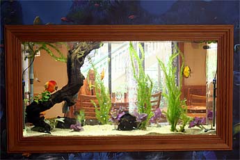 Our aquarium is finally finished and back in full operation after quite some down time. It is set in the wall between two rooms, visible from both sides. We switched from salt water to warm fresh water.