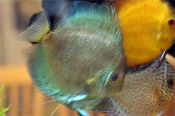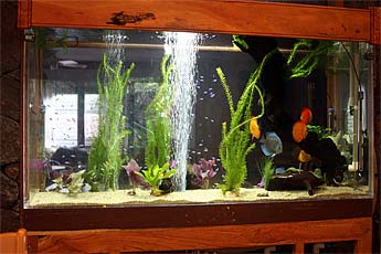 The tank contains large 6 inch fish called Discus (which we call Chakra) that originated from the Amazon in Brasil. Hard to tell from the photo, but the tank is actually 6 feet across and holds 269 gallons.