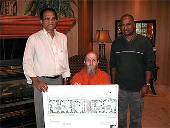 Panch Panchalingam and Raja Ramaraja Gopal, treasurer and secretary of the Calgary, Sri Murugan Society, are showing Bodhinatha the site plan for a 30-acre parcel that was purchased by several Hindu societies in June 2002. The Murugan society's portion of the parcel measures 10 acres.