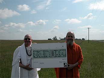 Bodhinatha and Sadhaka Haranandinatha hold the site plan in front of the property. It's only eight minutes from the airport in what is now farm lands. Can you visualize a Murugan temple on this spot? See their website http://srimurugansocietyofalberta.com/