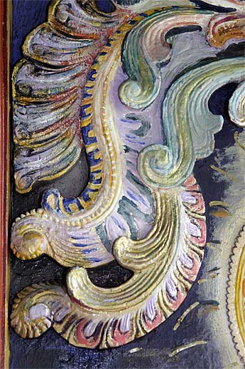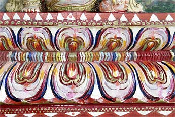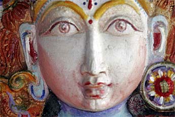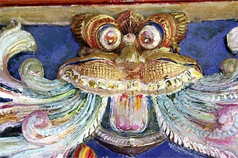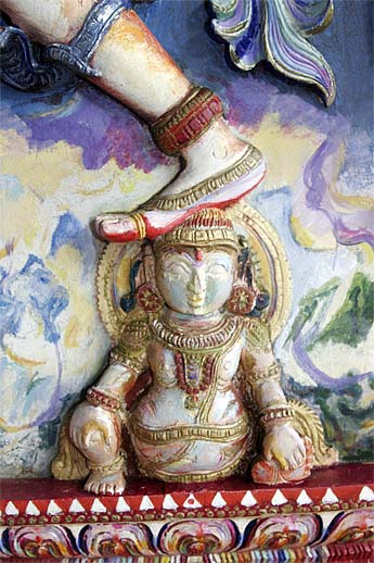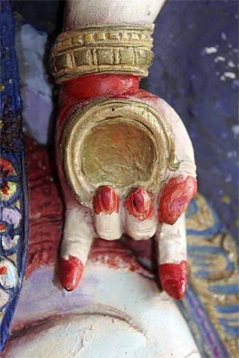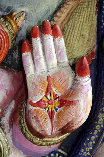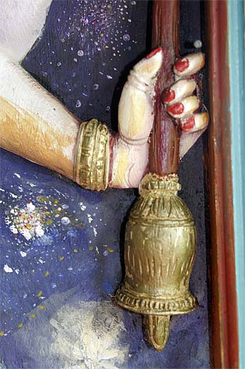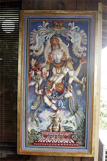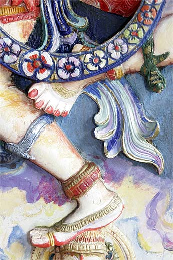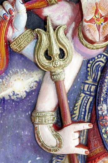 This wood relief sculpture of Lord Nataraja that is on the wall by the doorway of our publications building is really a marvelous piece. Recently painted by one of our devotees here, Leonora Orr, today we wanted to capture all the different implements and hand poses... enjoy the close-ups.