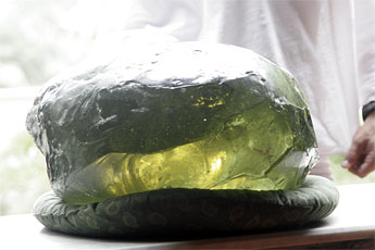 As promised we bring you some shots of the Andara Stone which was gifted to the Aadheenam by Lady Nellie yesterday (see yesterday's TAKA for details). We moved the stone to the courtyard ledge where he can get some sunshine. Saravananathaswami peers at the stone from the side.