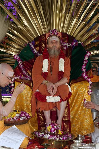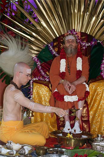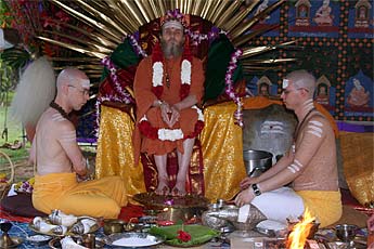 And this morning, his successor Satguru Bodhinatha Veylanswami sat on the peetham to receive the same puja.