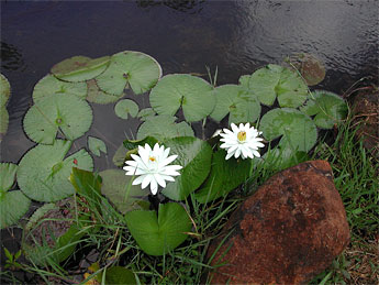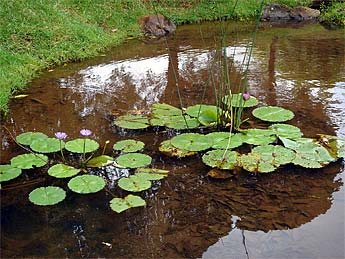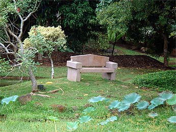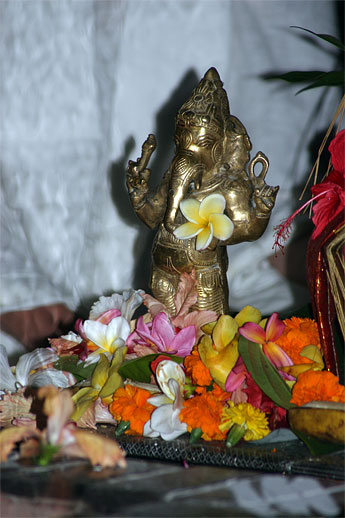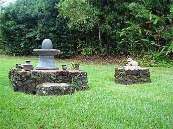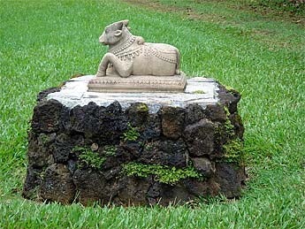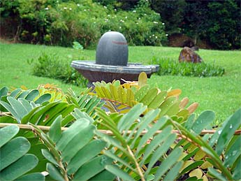 A warm July day on Kauai, with 30 or more visitors. Two families had been here four years ago and were telling the monks how much this special place has meant to their lives. Here's a peak at the Narmada Lingam through the bushes.