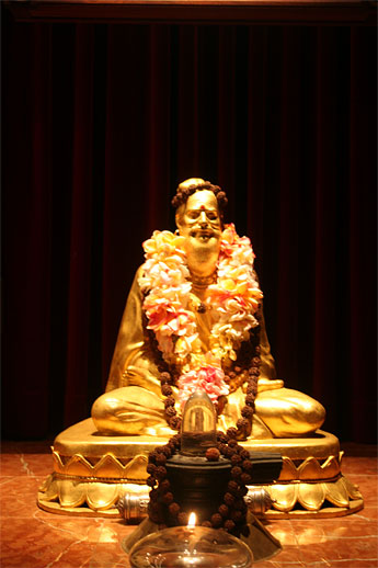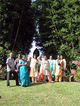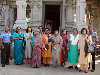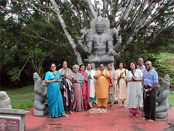 A group photo of all of our visitors in front of Dakshinamurthy and the four Sages.