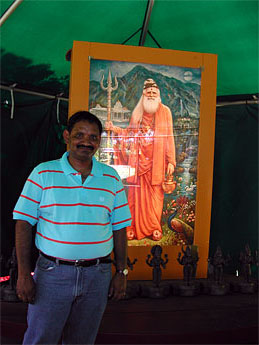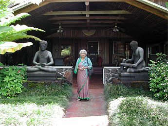 Returning back from the hill, Rukumani Satyananda stopped to have her photo taken beside St. Tirumular and St. Tiruvalluvar in front of the Aadheenam courtyard.